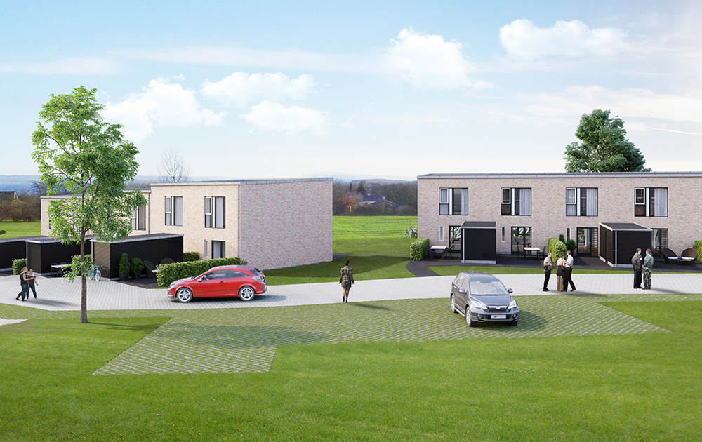 forhold til det kuperede landskab med en arkitektonisk vision om at integrere husene med